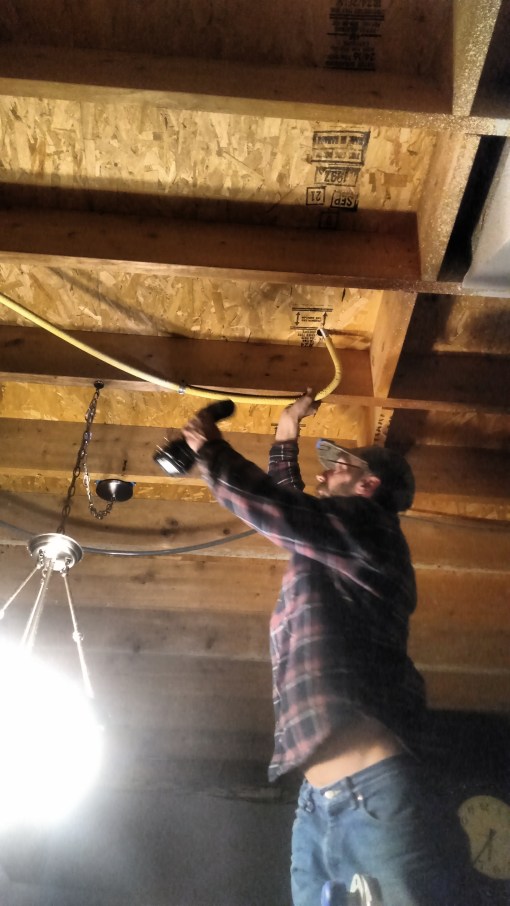 Dean moving the improperly installed gasline in the kitchen ceiling. There was a lot of this sort of thing. Major frustrations.