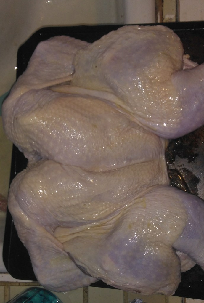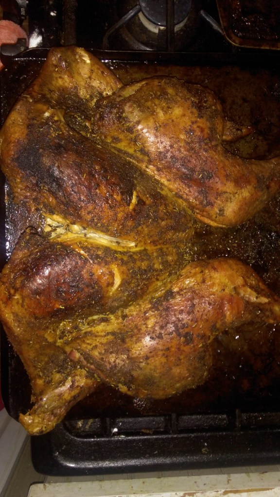 Dean got the grill going with an indirect heat set-up. I spatchcocked our little turkey. Oiled it up and put on a a Spice Island turkey rub. And then we smoked it for 4 hours.