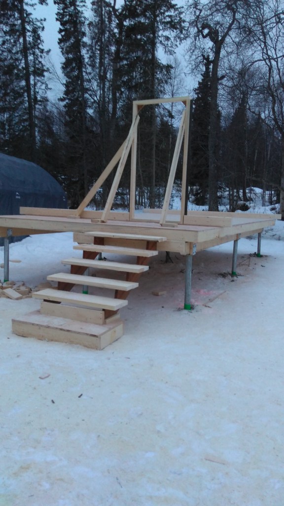 Temp stairs, door framed and first two logs laid.