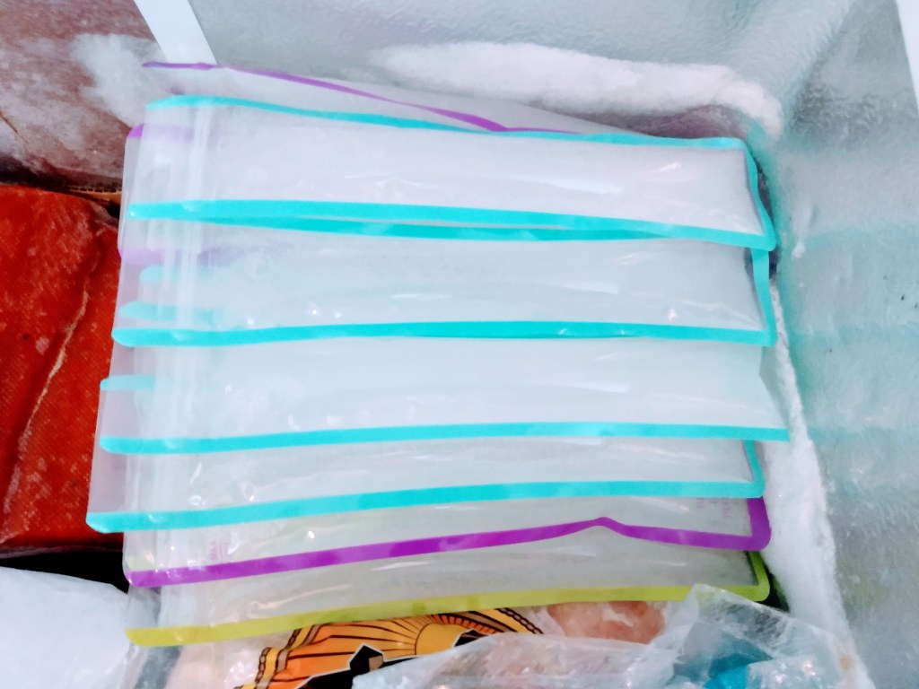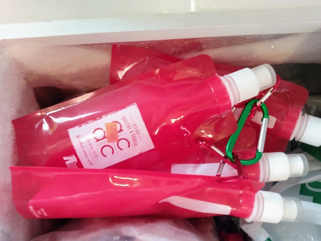 Our first gallon I poured into individual collapsible water bottles for drinking later. I found these new at the thrift store, a great find! They came with mini carabineers to clip onto your pack or belt while hiking this summer. Into the freezers they went.