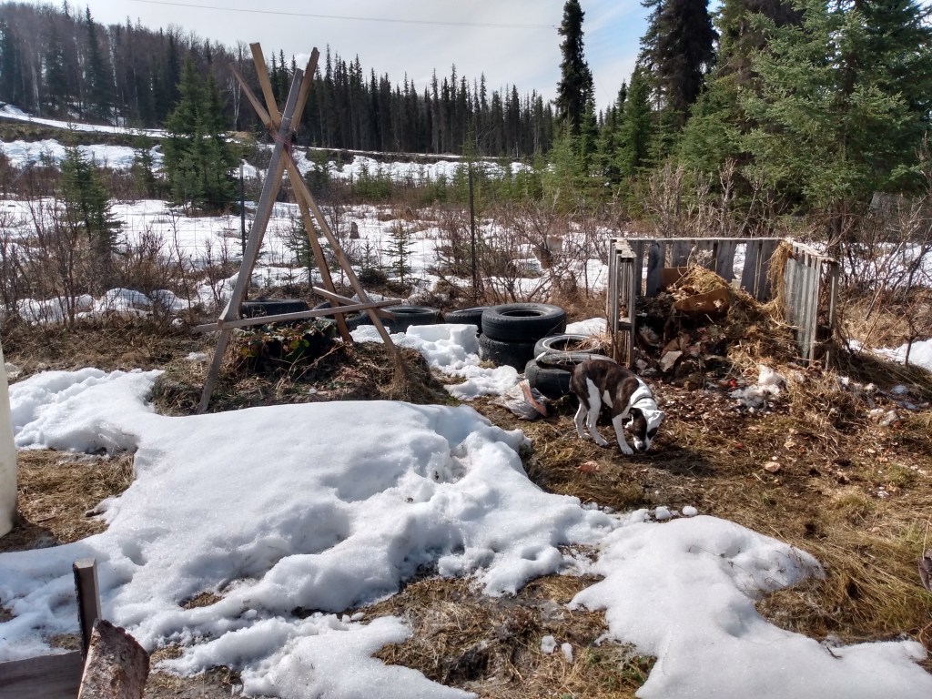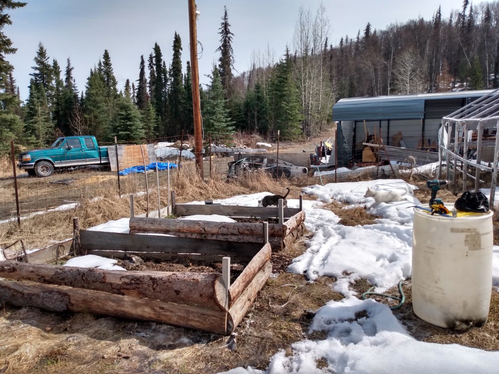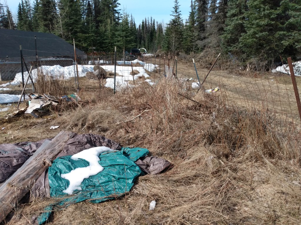 Before, tall grass, wadded up tarp.The strawberry tipi, tire stacks and compost bin. And Panda Bear.The old greenhouse frame. She’s a lean’n. And both doggos.The two existing raised beds.Before pics.
