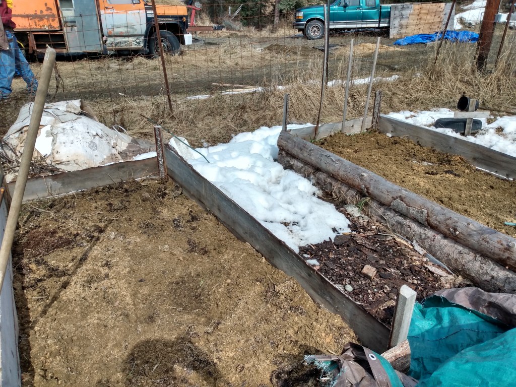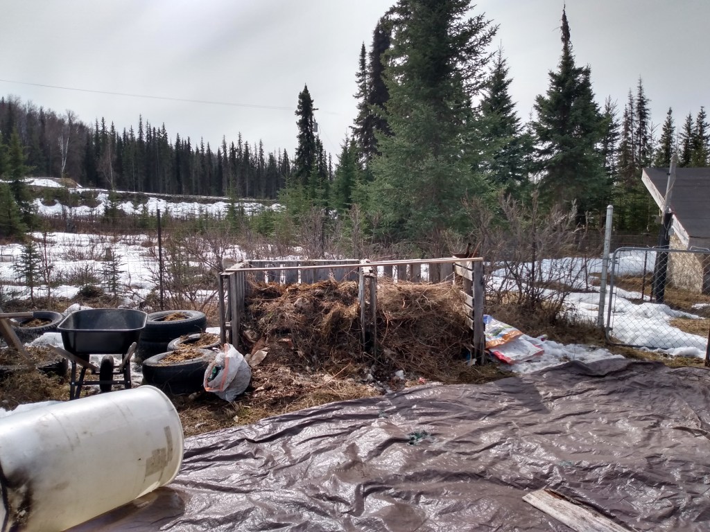 Then we found a couple old pallets that we hauled up to the garden plot to add to our existing compost bin. The original bin was filled up over the winter with kitchen scraps and barn litter. We’ll let that side sit and work this summer to add to our beds next year.