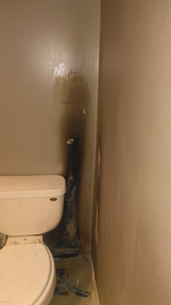 This kitchen is large, roughly 17′ x 16′ floor space. There’s appliances, including two freezers, that I cannot move out so we had to do the floor in halves. Everything that can’t go outside was shifted to the west side and the eastern half was completely cleared out.