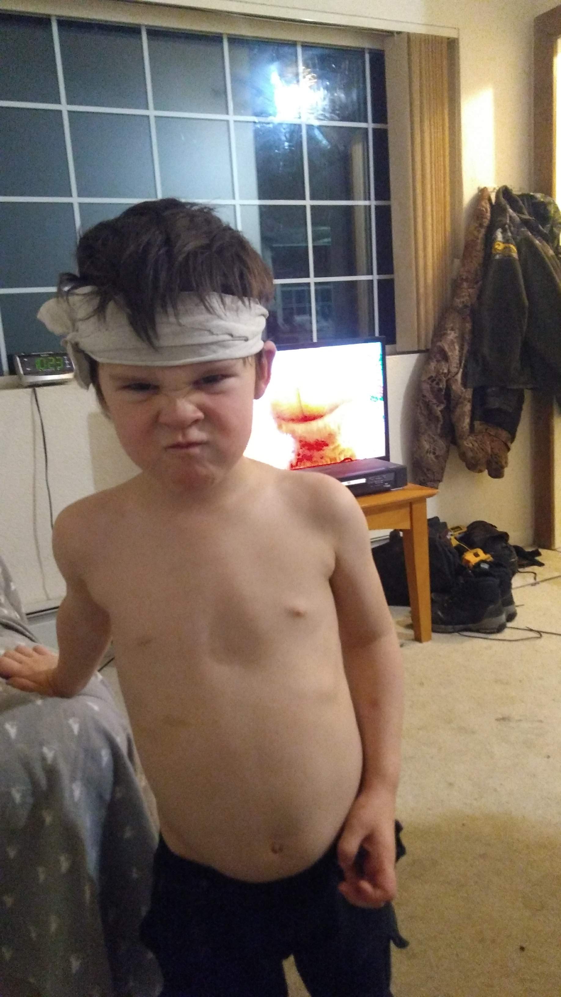 Fierce ninja warrior. He cracked his head open roughhousing with his brother. This child goes not do well with blood.