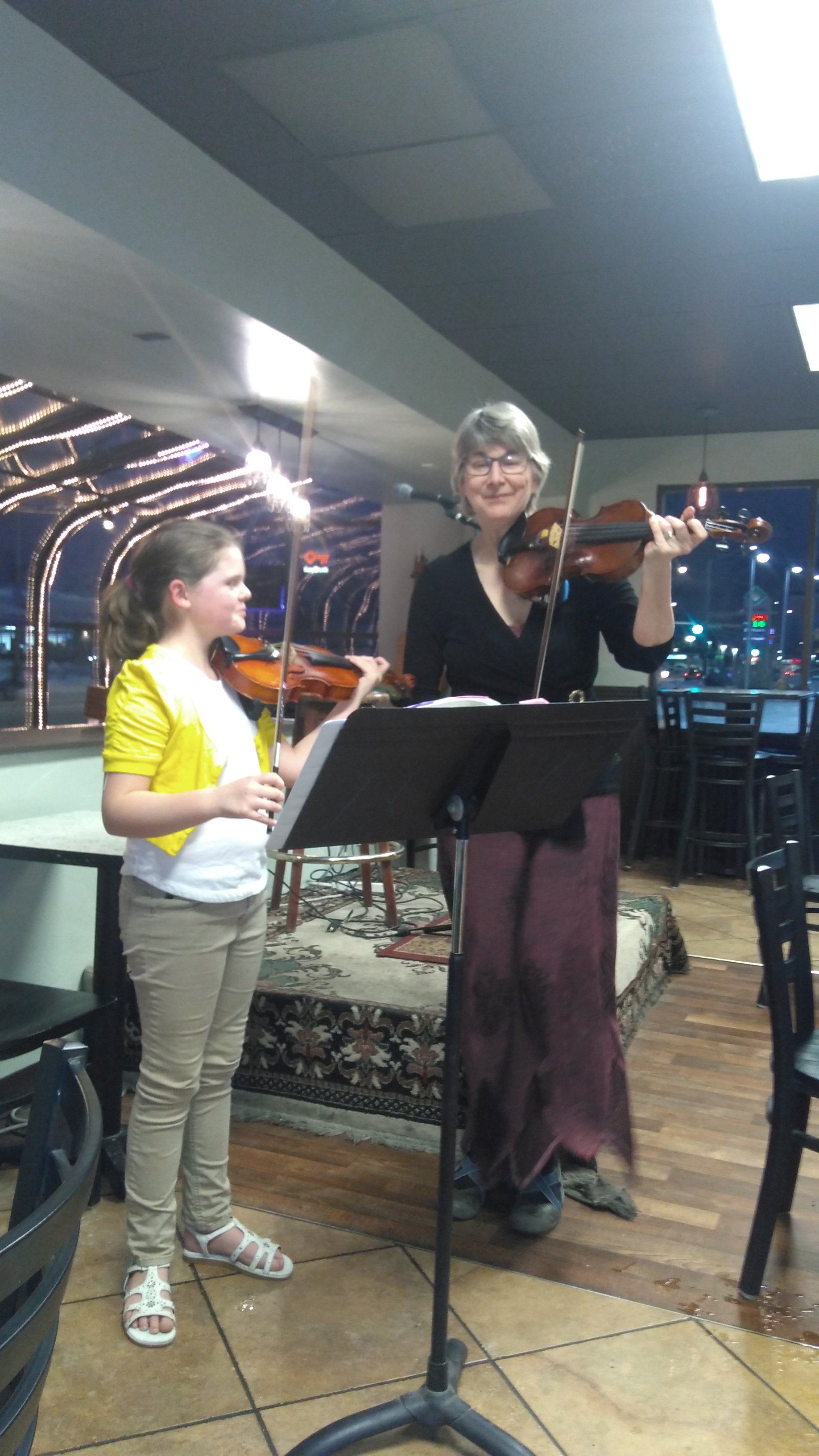 Lil Bit and her violin instructor at Odies Deli, for a recital.