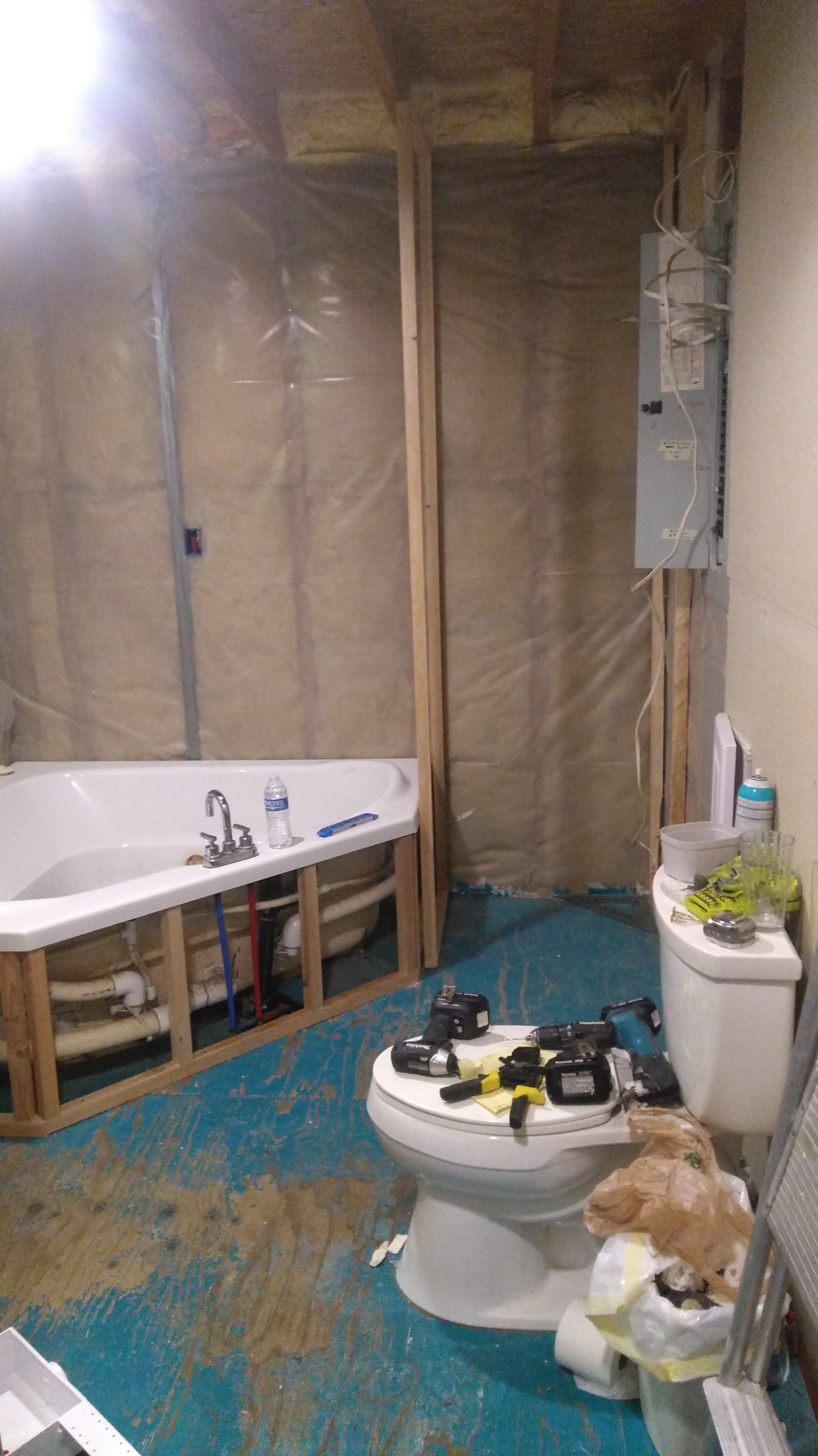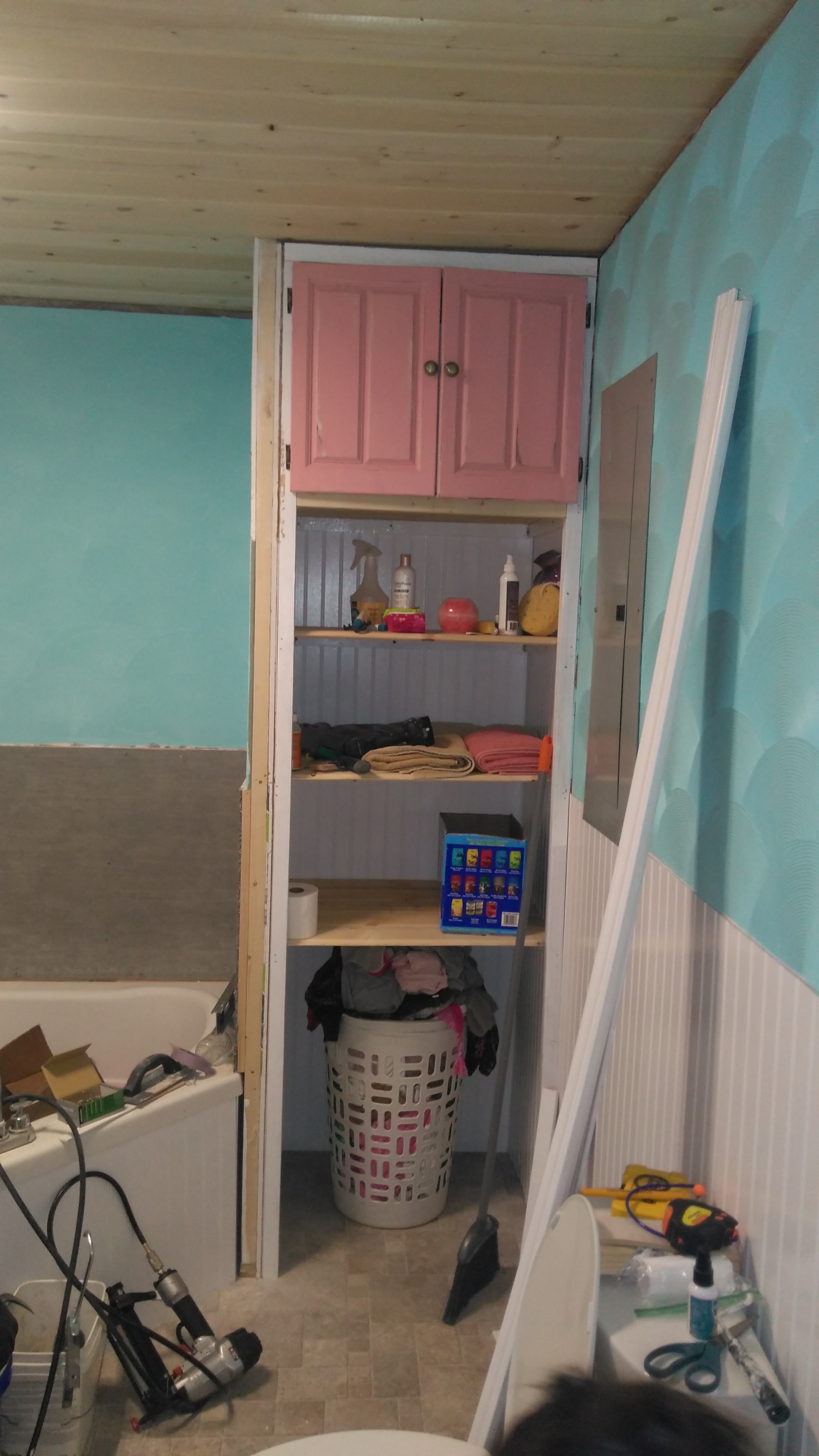 The main kitchen had essentially become a storage space for all our excess: tools, job materials, renovation materials, food storage and junk. Our first order of business was to empty the space out and tear up the ruined laminate. The kiddos were great at this and had it done rather quickly after the arduous task of moving out the stuff which took us a number of weeks.