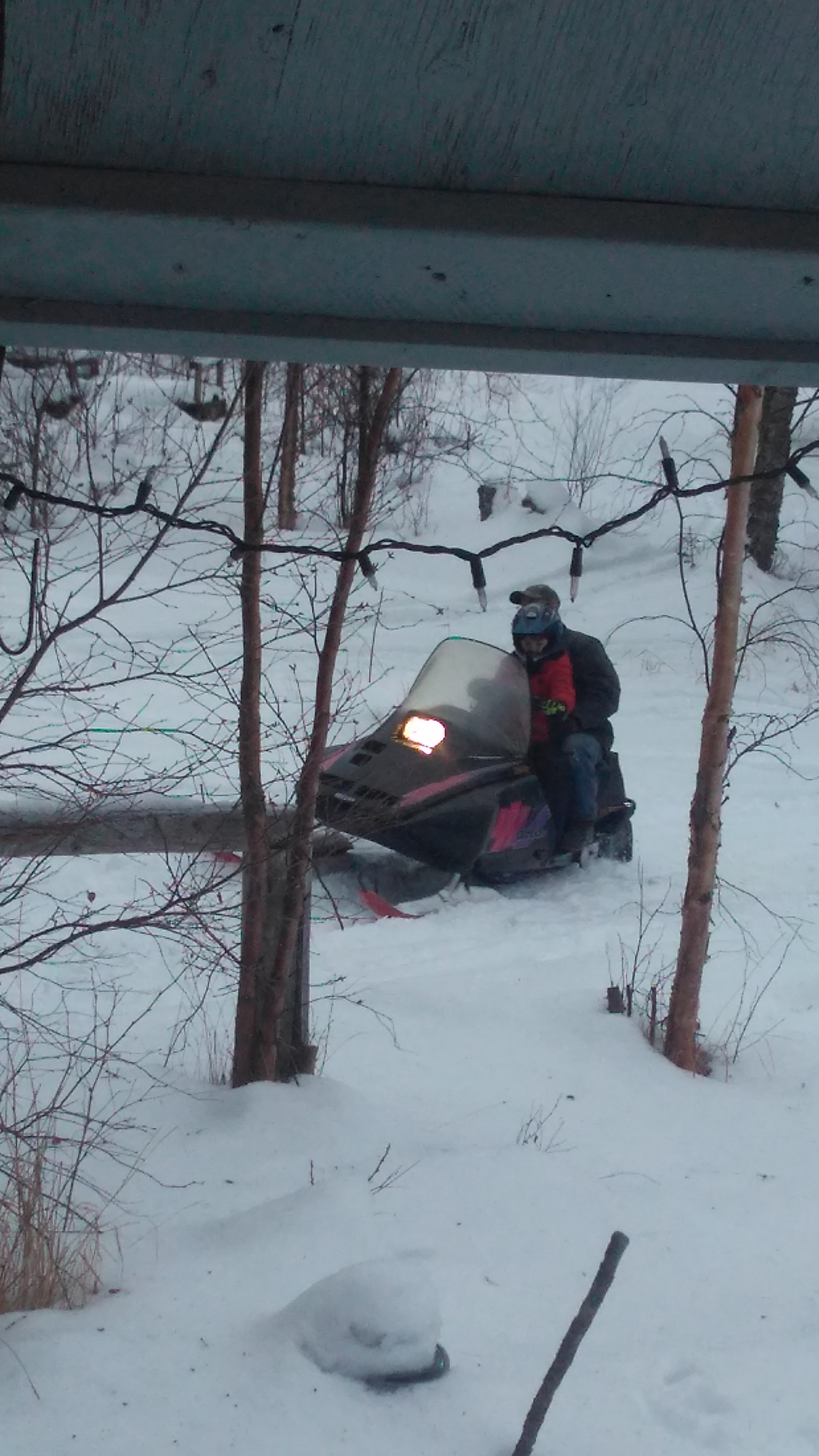 Little Mister has been learning to ride Lil’ Bit’s snow machine. He’s doing pretty good. Takes it nice and easy so far. His Dad packed down a trail around the cabin so he could get some practice laps in. Then he took him out on the trail for a longer ride.