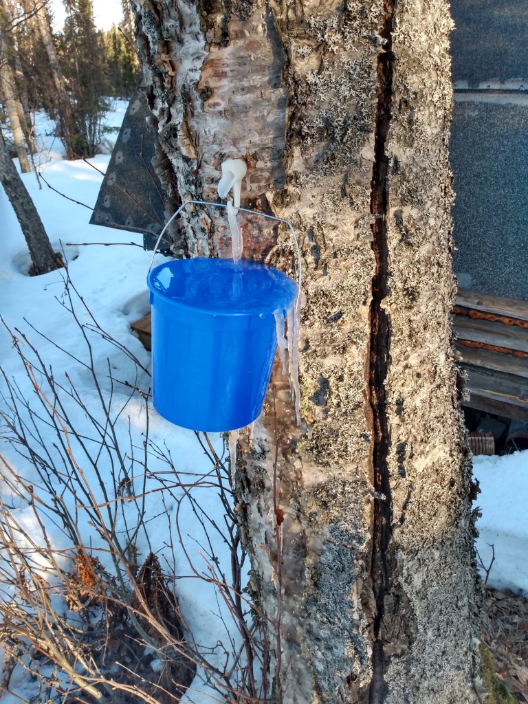 Our days are longer and warmer but our nights are still plenty cold. Perfect time to tap a birch. I bought some tree taps at the farm store last week and two new 2 gal buckets with lids. Once we got to the cabin she went out, drill and supplies in hand.